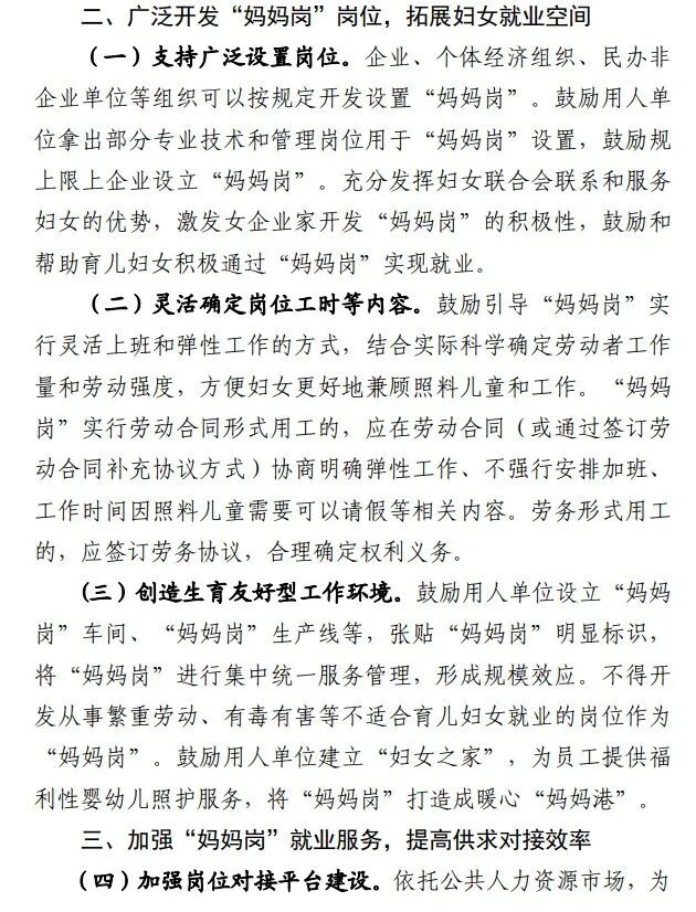 根据意见稿,“妈妈岗”是主要用于吸纳法定劳动年龄内对12周岁以下儿童负有抚养义务的妇女就业,工作时间、管理模式相对灵活、方便兼顾工作和育儿的就业岗位。