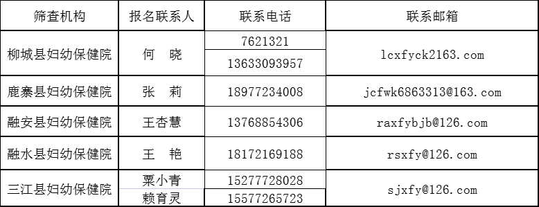 到柳城县、鹿寨县、融安县、融水苗族自治县和三江侗族自治县妇幼保健院筛查的市民可按下表联系报名。