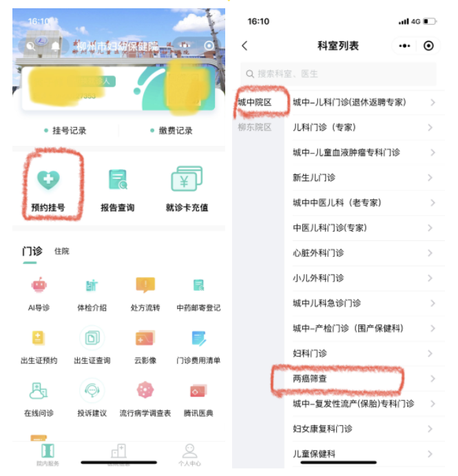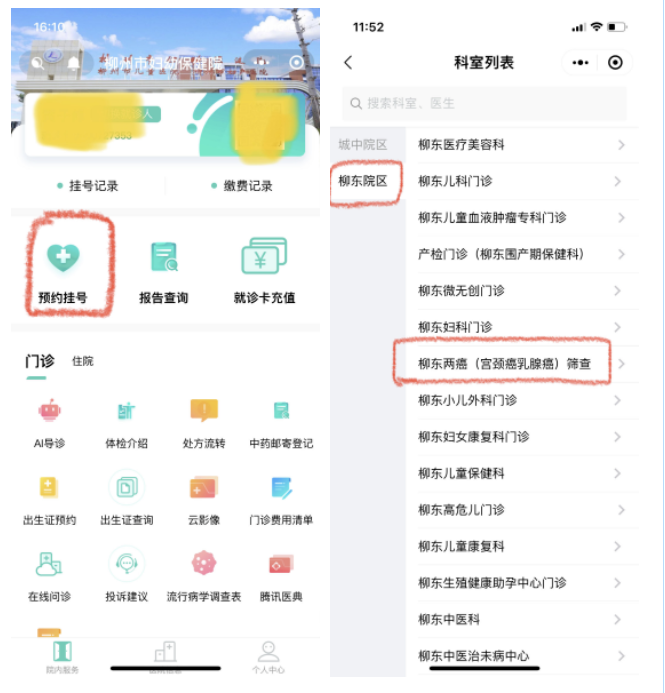 到柳州市妇幼保健院(城中区映山街50号)筛查的市民请微信关注“柳州市妇幼保健院”微信公众号,按下面步骤进行预约。