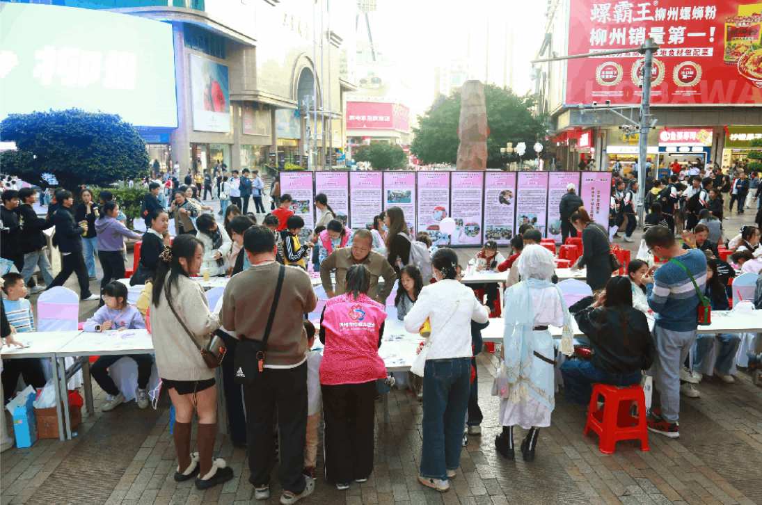 11月22日下午,柳州五星步行街暖意涌动、人潮如织。一场以“家庭零暴力 让爱住我家”为主题的大型普法宣传活动在此温情上演。活动由柳州市妇联牵头,市委政法委、市总工会、团市委、市残联、市中级人民法院、市人民检察院、市教育局、市公安局、市司法局、市民政局、市卫健委等十余家单位共同打造,以“互动体验+专业咨询+趣味打卡”的创新形式,将法律知识与健康关怀送到市民身边。