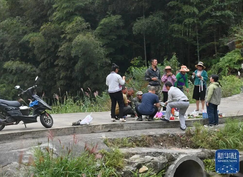 ▲杨宁(右一)和邻村(吉曼村)村民们在田边一边吃午饭,一边协商山泉水引水工程相关事宜(10月8日摄)。