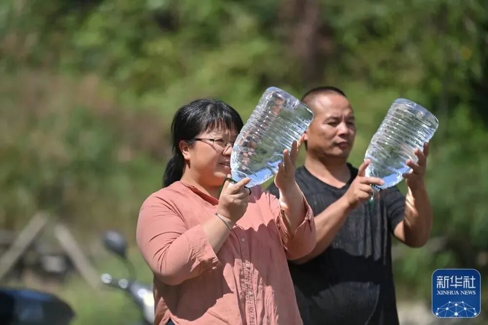 ▲杨宁(左)在查看村民刚刚采集的水样,为山泉水引水工程做准备(10月8日摄)。