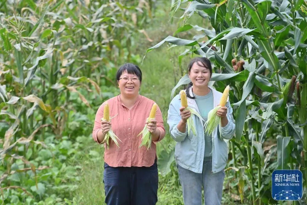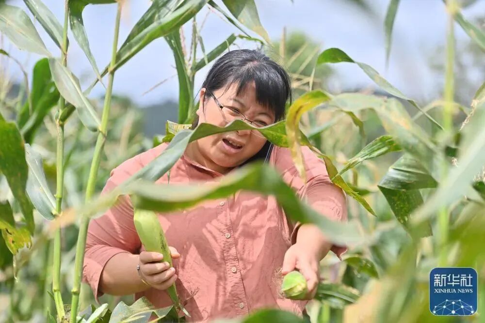 ▲杨宁(左〉在展示今年试种的新品玉米(10月8日摄)。