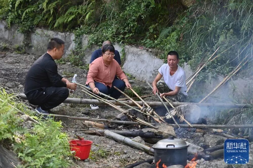 ▲杨宁(左二)和邻村(吉曼村)村民们在田边做午饭,准备协商山泉水引水工程相关事宜(10月8日摄)。