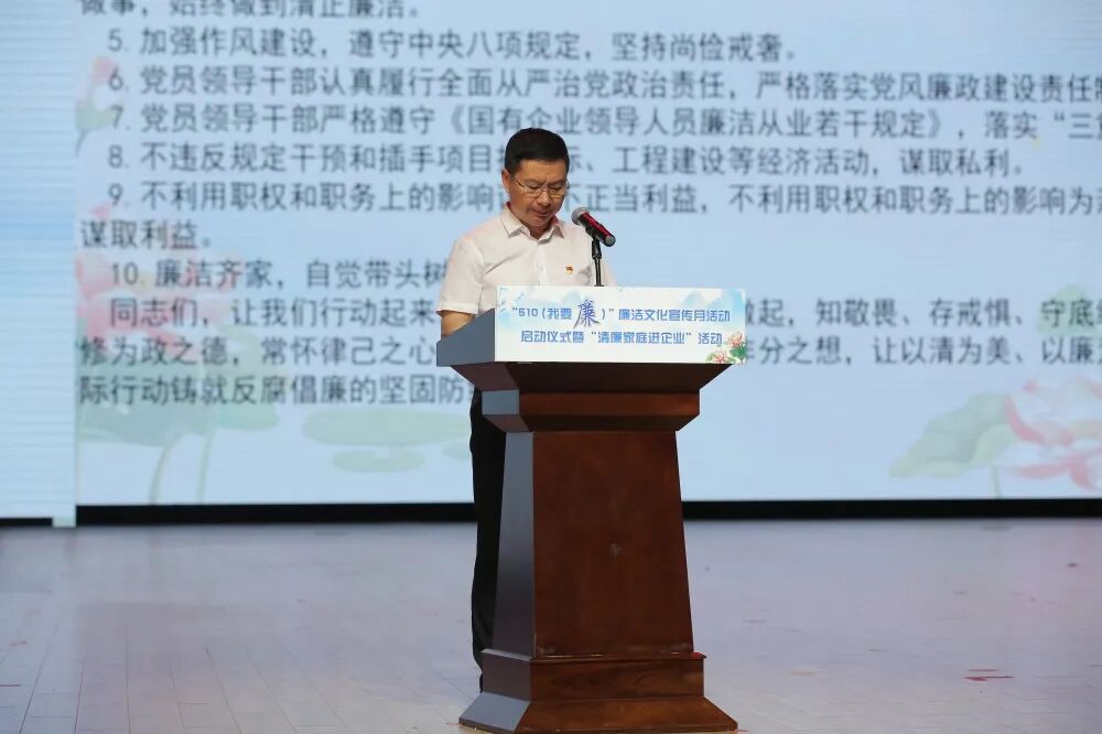 市国资委党委副书记、副主任曾惠新宣读“廉洁从业倡议书”,介绍“510(我要廉)”廉洁文化宣传月安排