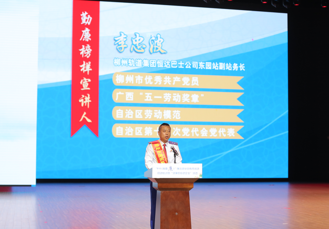 活动还邀请“勤廉榜样”市轨道集团恒达巴士公司李忠波作宣讲,市委宣传部一级调研员张骏驰分享“最美家庭”故事,广西建工冶建公司表演廉政情景党课《永远跟党走 清廉来护航》。