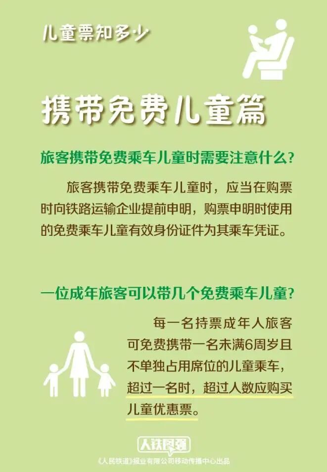 每一名持票成年人旅客可免费携带一名未满6周岁且不单独占用席位的儿童乘车。携带免费乘车儿童时应向铁路运输企业提前申明,可在铁路12306App、自助售取机、人工售票窗口进行免费乘车儿童申报操作,购票申明时使用的儿童有效身份证件就是孩子的乘车凭证。