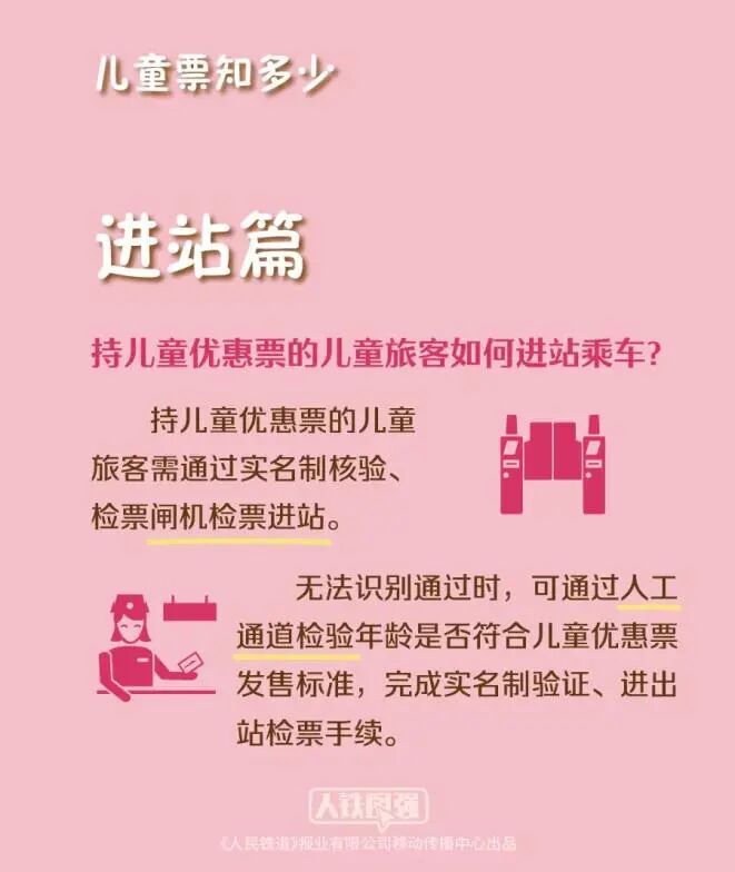 根据今年1月1日新版《铁路旅客运输规程》,随同成年人乘车的儿童,年满6周岁且未满14周岁的应当购买儿童优惠票,儿童优惠票须使用儿童本人的身份信息购买。相应的,持儿童优惠票的儿童旅客进站时应出示本人的身份证明,通过实名制核验、检票闸机检票进站。