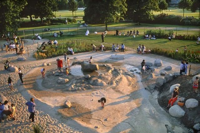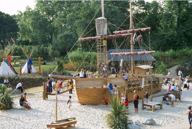 作为冒险游乐场的代表,伦敦市威尔士戴安娜王妃纪念游乐场(Diana, Princess of Wales Memorial Playground)为儿童提供多样化的开放式游戏选择,其最突出的特点是一个全尺寸的木制海盗船,作为孩子们的攀爬区域,周围是沙子,可供孩子们在其中玩耍。