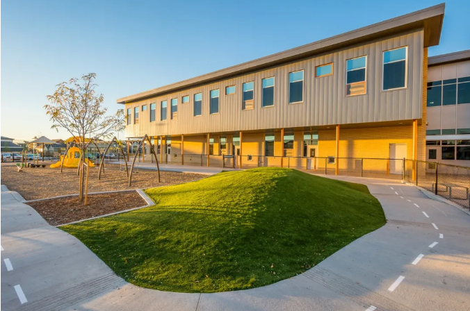 场地中还包括一个浅黄色的砂岩圆形剧场,其遮阳结构以叶子切割为特色,一个巨大的杨木树桩创造了野餐桌和座位,以及一座横跨鹅卵石河床的人行桥。蚀刻的踏脚石嵌入在碎石人行道上,树桩小径形成了具有冒险性的平衡步行道。社区中还设计并安装了异想天开的通心粉形状的花园床,用于实践学习体验。