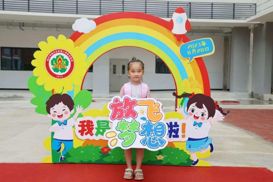 “来来来,和新学校一起合个影,你们是小学生啦!”8月29日,在新投入使用的柳江区拉堡小学(航岭校区),学生纷纷在校内的迎新标语前拍照留影。