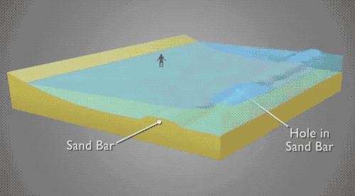 当岸边的沙洲出现了一个豁口时,此处往往就会产生离岸流,因为水流从这里能更方便地回家。在海岸边,离岸流的典型特征就是沙漏形态。