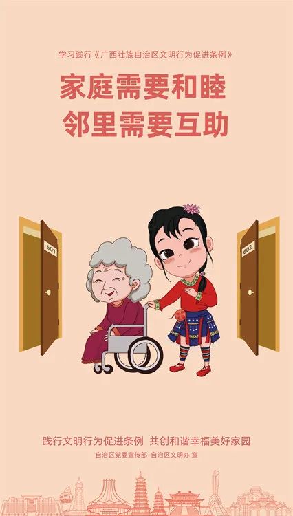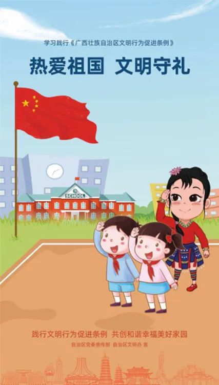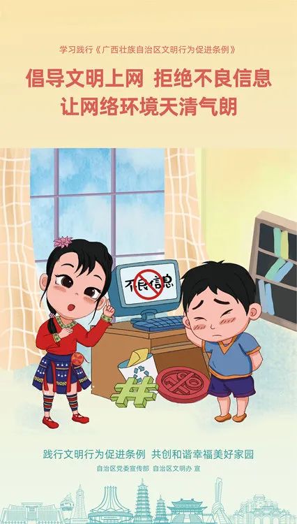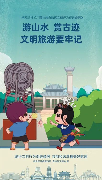 《广西壮族自治区文明行为促进条例》(以下简称《条例》)自2019年9月1日起施行。围绕《条例》涉及的公共秩序、爱护环境、文明礼仪、文明出行、文明旅游、文明用餐、文明上网、文明养犬、拒食野味等方面主题内容,自治区党委宣传部、自治区文明办精心制作10幅富含广西地域特点、人文风情、民族特色等代表元素的宣传挂图,推出一个活泼可爱、富有感染力的刘三姐卡通形象,通过简明扼要、通俗易懂的内容提示和故事新说,对《条例》进行全面阐述。