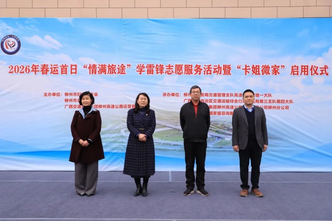 正值2月2日的春运首日,由柳州市妇女联合会、柳州市总工会、柳州高速公路运营有限公司联合主办的“情满旅途”学雷锋志愿服务活动暨“卡姐微家”启用仪式在新兴微型服务区温馨启动。活动以“平安春运路 情暖卡姐心”为主题,为广大司乘人员特别是女性货运司机、卡姐及家属送上新春的关怀与祝福,正式拉开2026年柳州高速公路春运服务保障的暖心序幕。