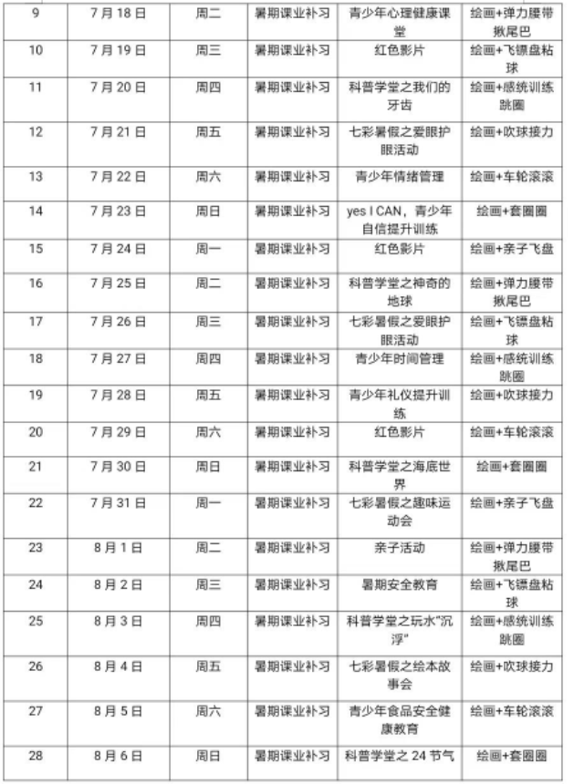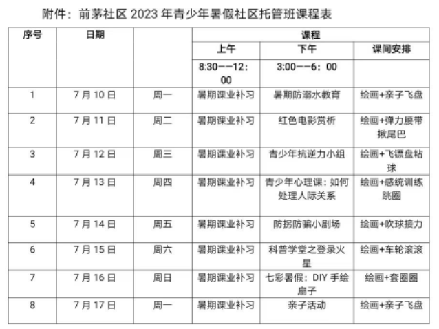 据了解,该暑假托管服务从7月10日持续到8月8日,托管地点在碧桂园滨江府小区党群服务中心。每星期设一期托管班,每班最多收40名青少年。托管班服务时间为星期一至星期日的8:30——12:00,午托12:00——15:00,15:00——18:00。