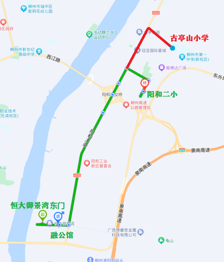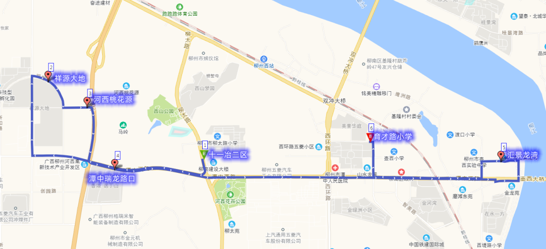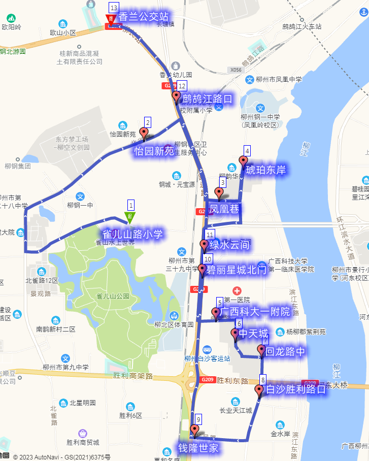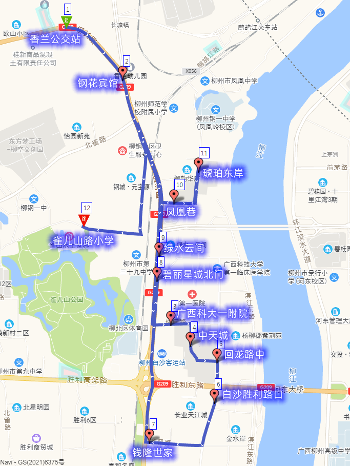 返程:雀儿山路小学→怡园新苑→凤凰巷→琥珀东岸→广西科大一附院→中天城→回龙路中→白沙胜利路口→钱隆世家→碧丽星城北门→绿水云间→鹧鸪江路口→香兰公交站