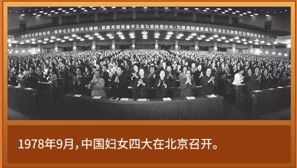1978年9月8日至17日,中国妇女第四次全国代表大会在北京召开。华国锋等党和国家领导人出席开幕式。全国人大常委会副委员长、全国妇联副主任邓颖超致开幕词,指出这次大会是全国各族妇女为尽快建成社会主义四个现代化强国而奋斗的动员大会和誓师大会,号召全国妇女积极动员起来,为完成新时期妇女运动的崇高任务作出新的贡献。全国妇联副主任康克清代表全国妇联第三届执行委员会作题为《新时期中国妇女运动的崇高任务》的报告。报告总结了中国妇女三大以来21年中国妇女运动的经验,高度评价了妇女在社会主义革命和经济建设中的重要作用,对“文化大革命”中被颠倒的是非进行了拨乱反正,批判了“四人帮”破坏妇女运动的罪行,提出要完整准确把握毛泽东关于妇女解放运动的理论,正确贯彻执行马克思主义妇女运动路线。