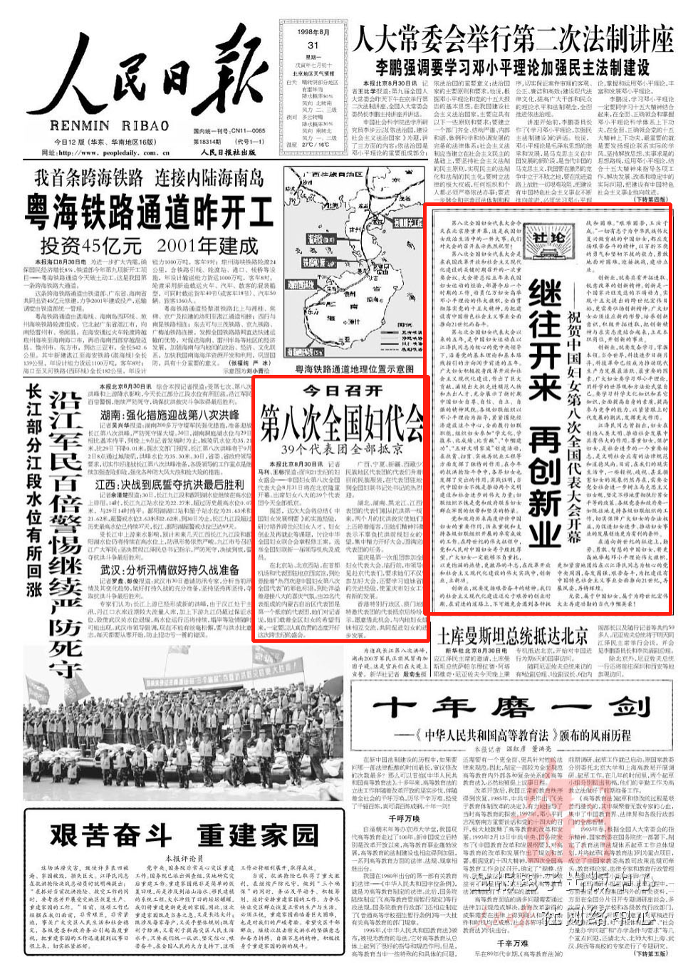 1998年8月31日至9月5日,中国妇女第八次全国代表大会在北京召开。中共中央总书记、国家主席、中央军委主席江泽民等党和国家领导人出席开幕式,中共中央政治局常委、中央书记处书记胡锦涛代表党中央作题为《在实现我国跨世纪发展的历史进程中充分发挥妇女的半边天作用》的祝词,高度评价妇女和妇联组织的历史作用,指出中国妇女运动的历史揭示了一个深刻道理:妇女的命运是同国家、民族的命运紧密相连的。只有跟随党积极投身于革命、建设和改革的伟大实践,妇女才能实现自身的解放、发展与进步。只有得到妇女这支伟大力量的积极支持和参与,我国革命、建设和改革事业才能取得成功。胡锦涛强调,妇女是“国家的半边天”,建设有中国特色社会主义伟大事业,必须有妇女这支伟大力量的广泛参与和不懈奋斗,希望广大妇女为深化改革和促进经济发展贡献更大的力量,为推动社会主义精神文明建设多作努力,更好地适应现代化建设的需要,在全面推进伟大事业进程中,建立新功业,弘扬新风尚,取得新进步,同全国人民一道昂首阔步迈向新世纪。要求妇联组织必须坚持把邓小平理论作为工作的指导思想,始终坚持坚定正确的政治方向,自觉服从服务于全党全国工作大局,找准建设有中国特色社会主义的经济、政治、文化与妇联工作的结合点,把全心全意为广大妇女群众服务作为全部工作的出发点和落脚点,在实现跨世纪发展历史进程中担负起新的光荣任务。强调妇联工作是党的群众工作的重要组成部分,要求各级党委认真研究新的历史条件下妇女运动的特点和规律,进一步加强和改善对妇联工作的领导。
