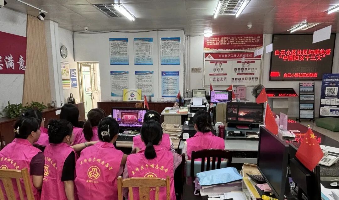 鱼峰区荣军街道白云小区社区组织巾帼志愿者收看中国妇女十三大新闻