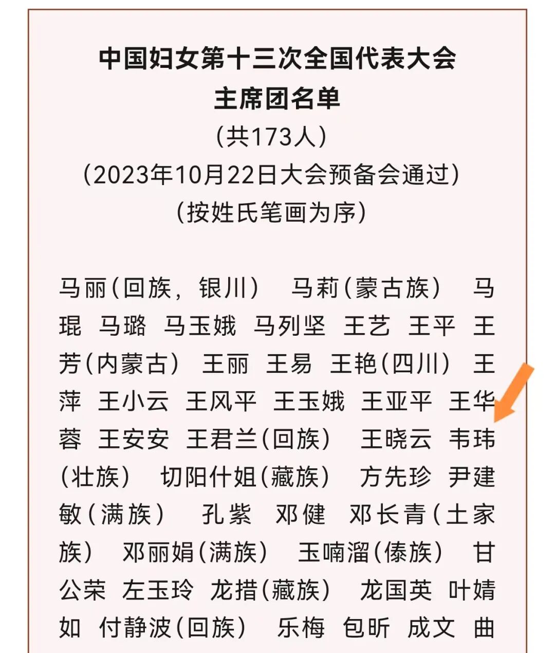 10月22日下午,中国妇女第十三次全国代表大会举行预备会议。全国妇联主席沈跃跃主持会议。会议通过了大会代表资格审查委员会名单、大会主席团名单和秘书长名单。柳州代表韦玮当选为大会主席团成员。