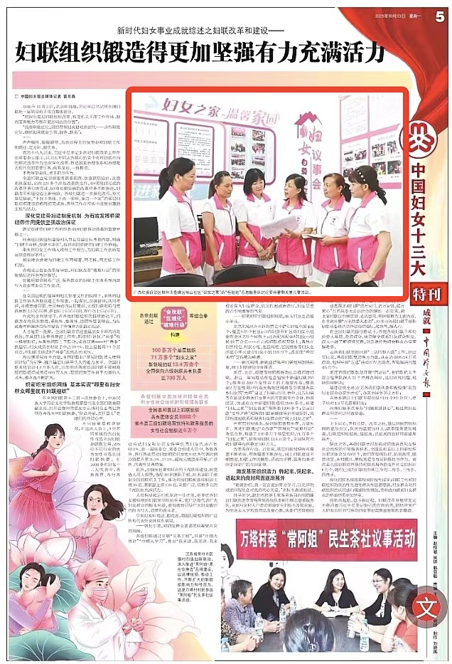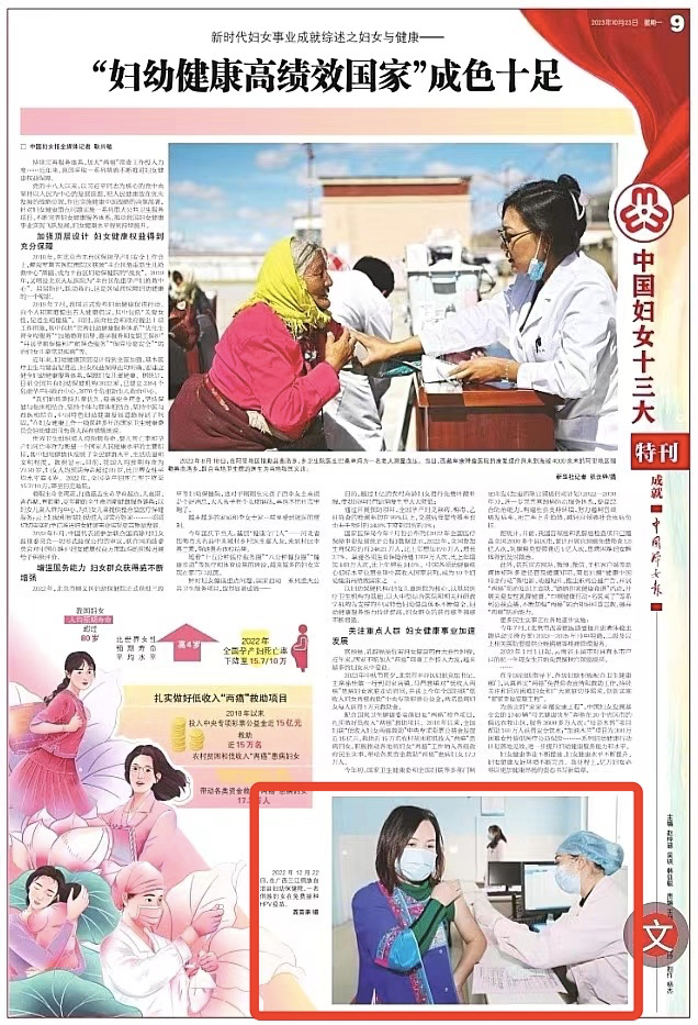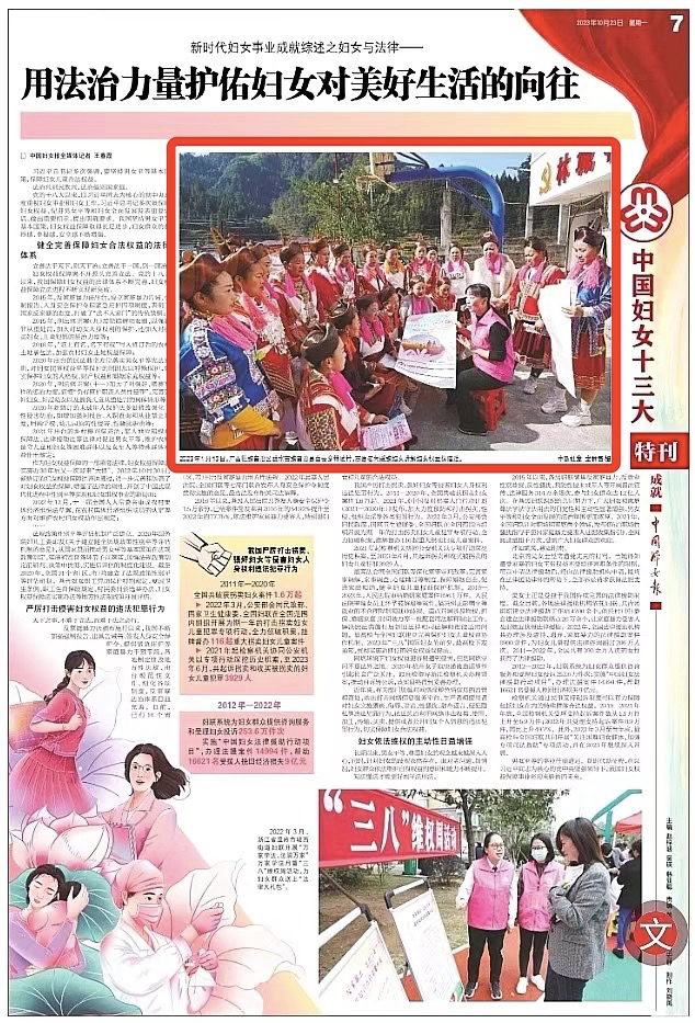 10月23日,全国妇联在《中国妇女报》发表题为《新时代妇女事业成就综述之妇联改革和建设——妇联组织锻造得更加坚强有力充满活力》《新时代妇女事业成就综述之妇女与法律——用法治力量护佑妇女对美好生活的向往》《新时代妇女事业成就综述之妇女与健康——“妇幼健康高绩效国家”成色十足》的3篇文章,总结回顾党的十八大以来妇女儿童工作成效,每篇文章均使用柳州市妇联工作配图。