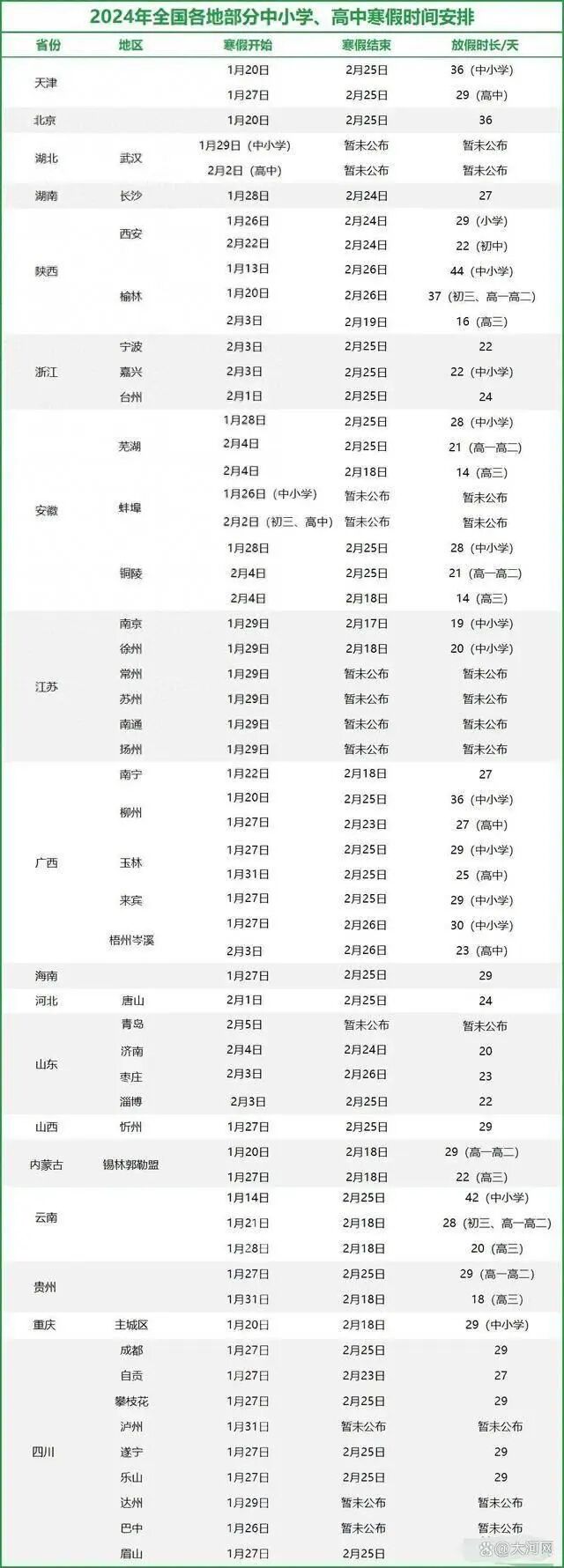 需要注意的是,以上仅为部分省份地区统计,内容仅供参考,具体放假时间请以当地教育局公布时间为准。