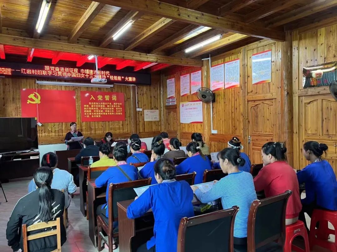 11月8日,广西三八红旗手,三江侗族自治县洋溪乡红岩村党总支部书记潘彩琼宣讲习近平总书记重要讲话精神及中国妇女十三大精神。