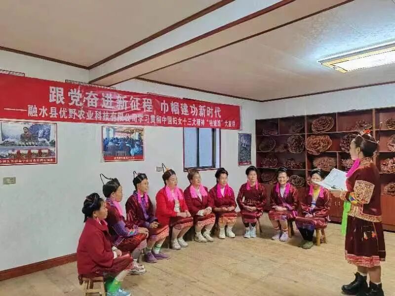 11月9日,“瑶寨春蕾”融水县白云乡致富带头人凤汪梅为公司妇女宣讲习近平总书记重要讲话精神及中国妇女十三大精神。