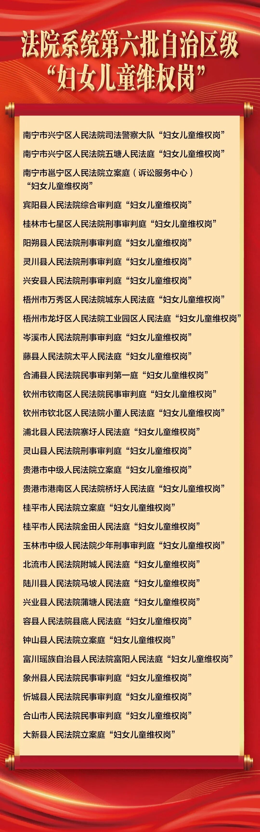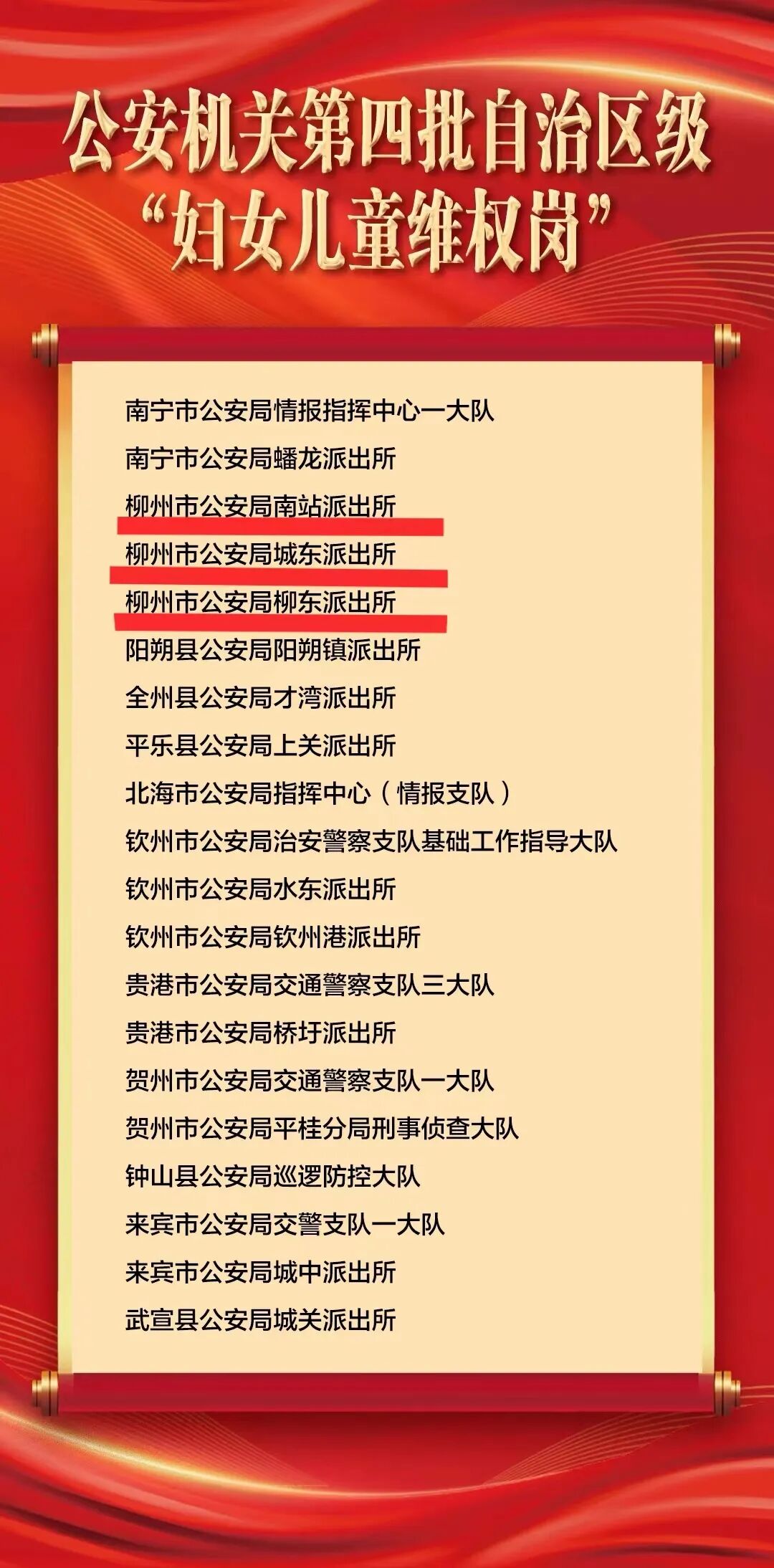 2023年11月27日,自治区反家暴联动机制工作领导小组第八次全体会议上公布了新命名73个自治区级“妇女儿童维权岗”。其中,柳州市有4个市级“妇女儿童维权岗”获命名为自治区级“妇女儿童维权岗”。
