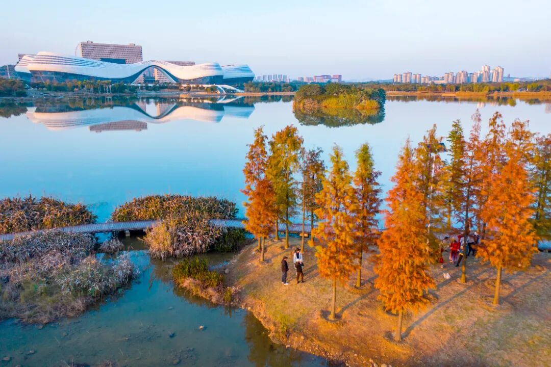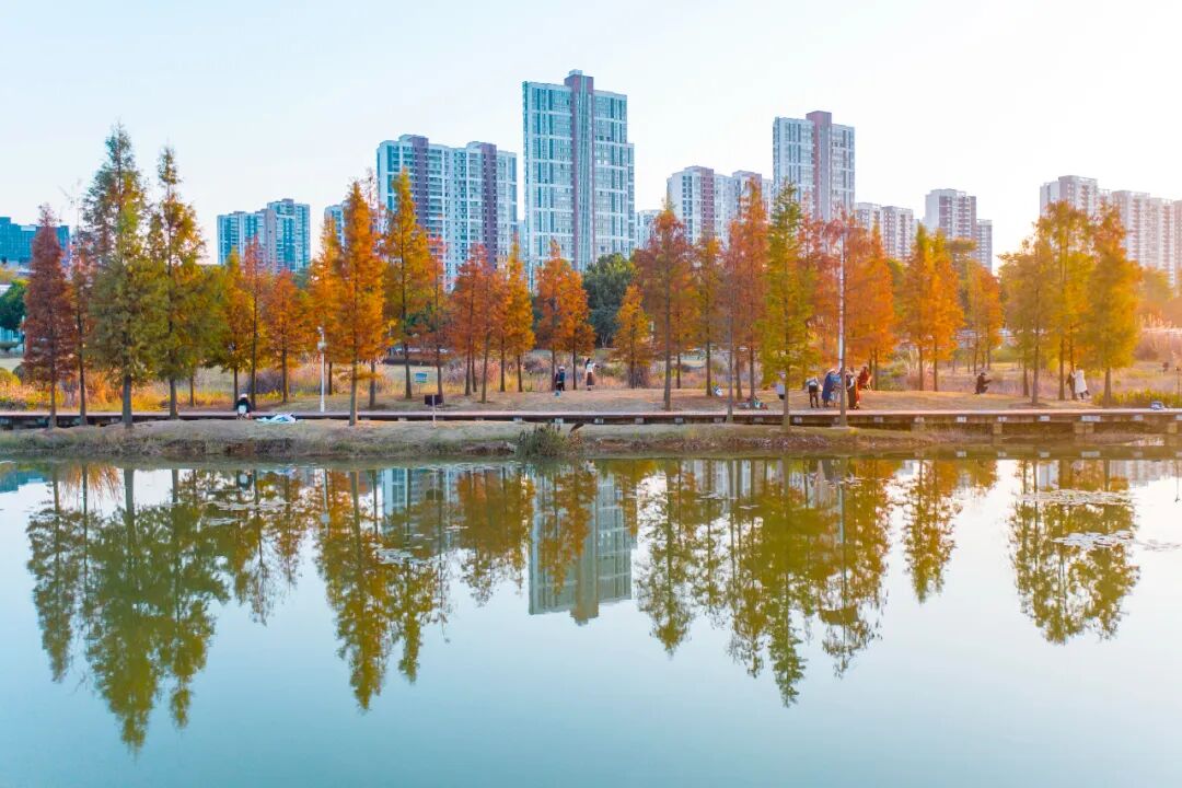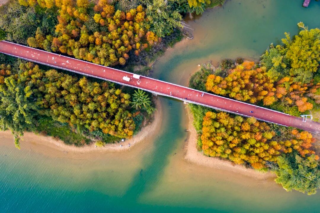 近日,龙湖公园沿岸和环江滨水大道旁的水杉逐渐染上了橙红色。从高处俯瞰,橙红色的水杉与碧绿的江水相映成趣,美不胜收。