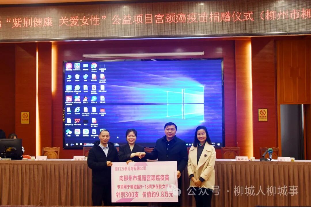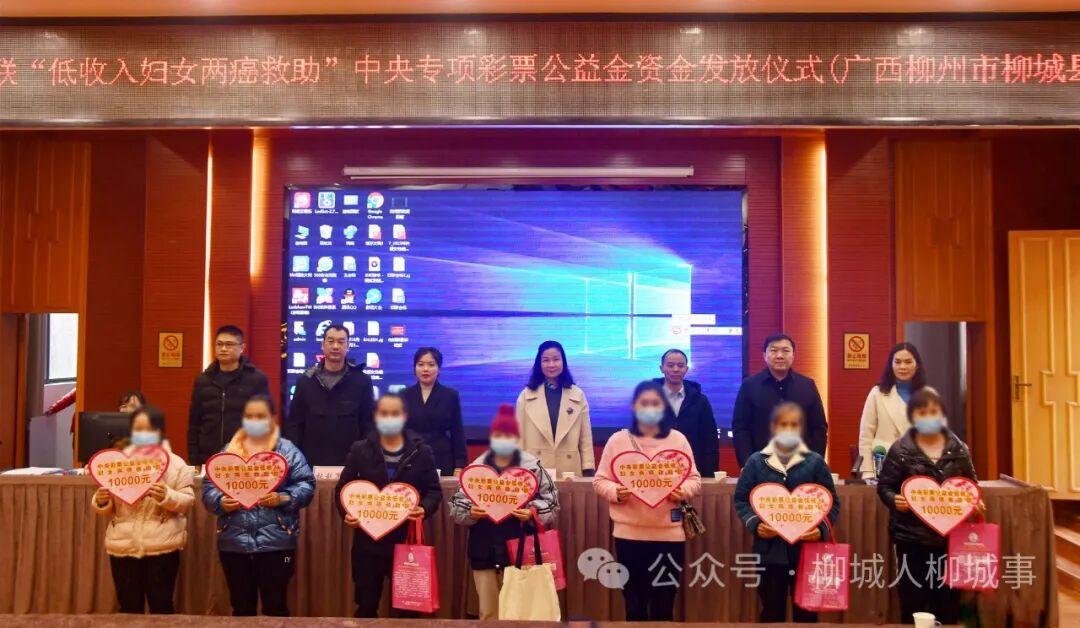 1月5日,柳城县举办2023年度低收入妇女“两癌”救助公益金集中发放仪式、巾帼健康行动“紫荆健康 关爱女性”公益项目宫颈癌疫苗捐赠仪式。在县委党校阶梯教室,与会领导向27名低收入妇女每人发放1万元的“两癌”救助金。市慈善总会向柳城县捐赠300支国产二价HPV疫苗(大肠杆菌)。