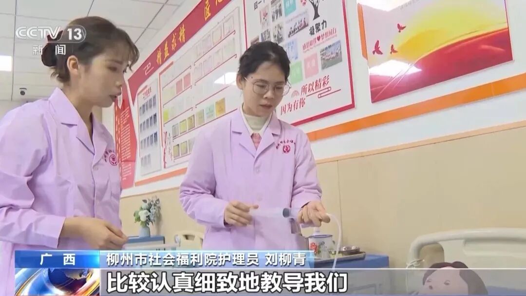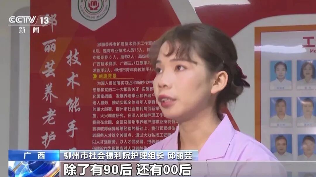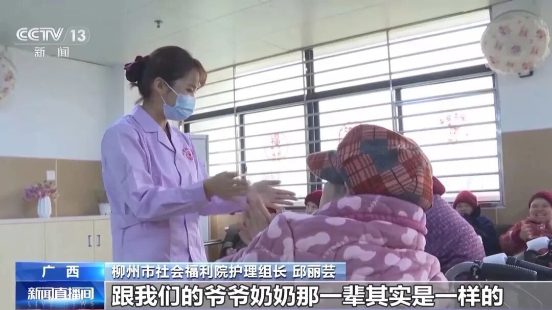 柳州市社会福利院护理组长 邱丽芸:这些院民都是特级护理的,他们大多数都是肢体残疾。刚开始来是觉得有点可怕,同时也觉得他们其实挺可怜的。工作11年在这个单位,也觉得他们反倒是比较可爱,跟我们的爷爷奶奶那一辈其实是一样的。失能半失能老人因为身体困扰,多数都有情绪或者心理的障碍,在跟老人们朝夕相处中,邱丽芸经常通过换位思考老人们的处境去理解他们,慢慢跟老人们建立起了感情。失能老人护理工作看似琐碎,其实每一个细节背后不仅需要专业的护理知识,还要靠临床的经验摸索,比如要把老人从轮椅转到床上,这样一个看似简单的动作,邱丽芸和他的同事们就摸索了无数遍,总结出了一套转移标准规范。柳州市社会福利院护理组长 邱丽芸:从床上抱他到轮椅上,这个操作可以利用老人的一些残余的力量,也能让我们老人得到锻炼。因为老人们患病、残疾情况不同,邱丽芸和同事收集了每个老人的信息,汇总成了“八知道”,要求护理员在护理老人之前,要了解老人的姓名、年龄、兴趣爱好、疾病情况等基础信息,还要知道老人的照顾重点,为每个老人制订个性化的照顾计划。如今,邱丽芸不仅参与制定了养老护理操作、情绪化解、服务礼仪等护理规范,为新来的护理员提供技术支撑,还成立了自己的“养老护理技术能手工作室”,带领年轻的护理员开展基础理论、专业技术、危机干预、情绪化解等业务学习交流。柳州市社会福利院护理员 刘柳青:刚开始非常忐忑、非常害怕,怕胜任不好这份工作。带教老师在工作上面比较认真细致地教导我们,教我们一些护理老人的操作,让我们没有那么紧张。柳州市社会福利院护理组长 邱丽芸:现在我们的团队当中,除了有90后,还有00后。有更多的年轻人加入我们的队伍中,其实我们也是想把我们这个有温度的养老服务工作,把它传递下去。
