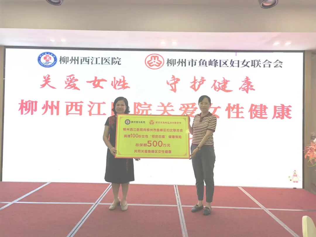 捐赠仪式上,柳州西江医院向鱼峰区妇联捐赠总保额500万元的女性“四癌”保险,为辖区100名困难适龄妇女的健康保驾护航。捐赠仪式后,鱼峰区妇联与柳州西江医院共同启动“女性健康科普公益讲座”,围绕宫颈癌、乳腺癌的危害和预防等内容,为辖区妇女普及女性生殖健康知识,帮助妇女关注自己、了解自己,树立健康生活理念。